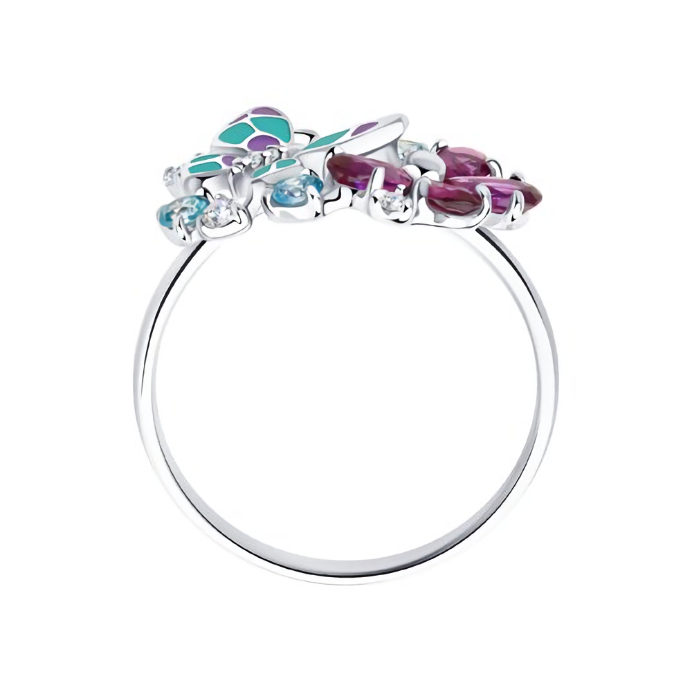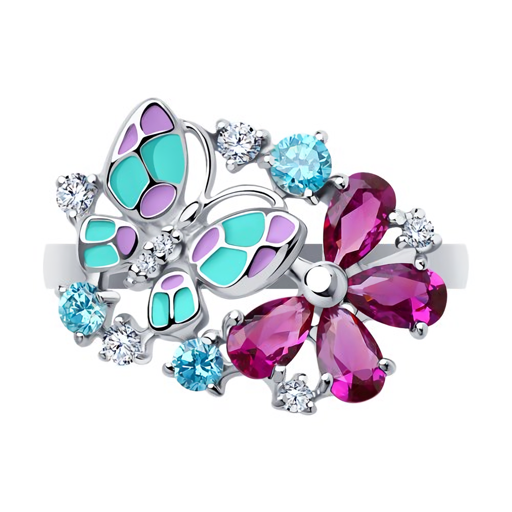 Das Symbol der Leichtigkeit und weiblicher Schönheit-der Schmetterling-wurde in diesem wunderbaren Ring aus Silber verkörpert. Der Charme und die wundervolle Farbe der Flügel haben die Juweliere mit Hilfe von dekorativen Emaille und schimmernden Zirkonia designt, wodurch ein realistisches Bild entstanden ist. Um ein solches Werk der Schmuckkunst zu schaffen, brauchte der Meister viele Stunde harter Handarbeit. Das Accessoire wird nicht nur sommerliche, sondern auch alle romantische Looks verschönern.
